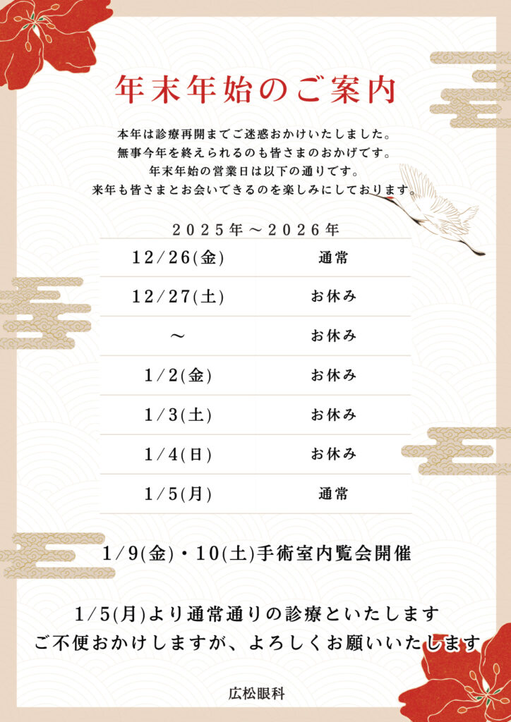2025.10.31 年末年始のご案内 本年は診療再開までご迷惑おかけいたしました。無事今年を終えられるのも皆さまのおかげです。 年末年始の営業日は以下の通りです。 来年も皆さまとお会いできるのを楽しみにしております。